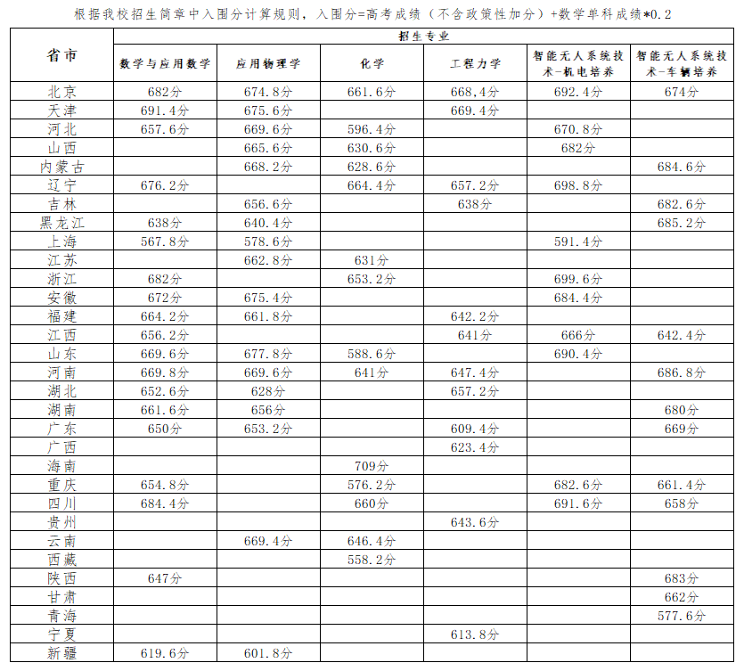我校2024年强基计划学校考核入围结果已发布,请考生登录强基计划报名系统(http://bm.chsi.com.cn/jcxkzs/sch/10007)查询本人入围结果。第一类考生入围分数线见下图,第二类考生按照简章中的标准入围。